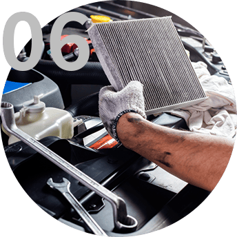 エンジンやキャビン内の空気を清潔に保つため、エアフィルターとキャビンフィルターを定期的に交換します。新鮮な空気をエンジンに送り込み、燃焼効率を高めます。また、車内の空気もクリーンに保ち、快適な環境を提供します。